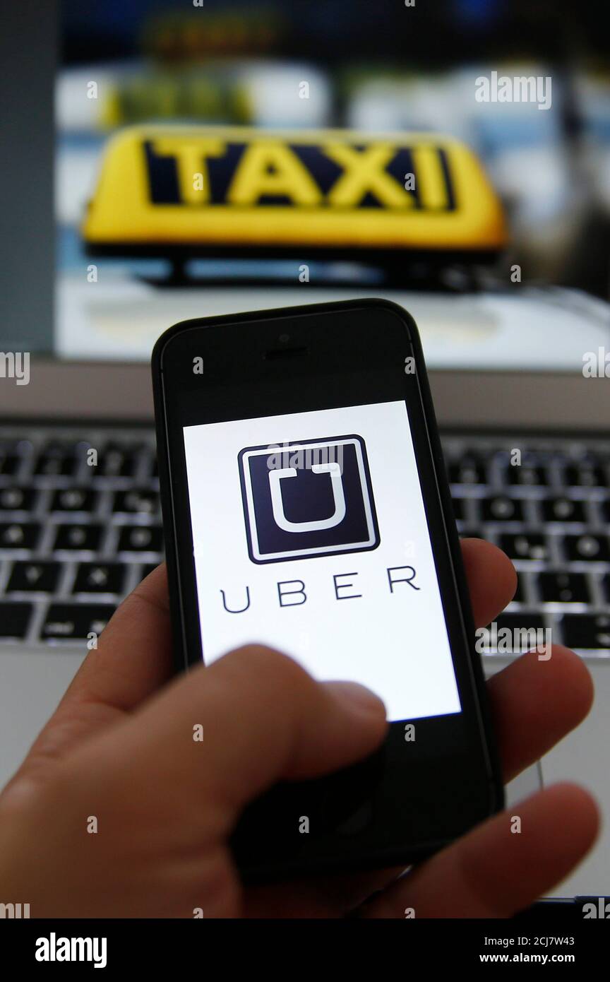 An Illustration Picture Shows The Logo Of Car Sharing Service App Uber On A Smartphone Next To The Picture Of An Official German Taxi Sign In Frankfurt September 15 2014 A Frankfurt High
